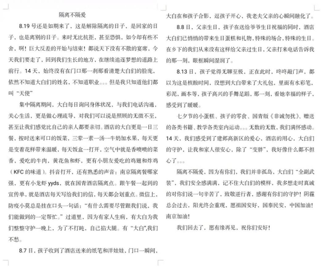 集中醫(yī)學(xué)觀察即將結(jié)束前,酒店工作人員收到了一份飽含深情的離別“禮物”。這是一封來自剛剛結(jié)束觀察生活、離開酒店順利歸家的市民朋友的感謝信,他用樸實(shí)真摯的語言回顧了與家人在酒店里生活的點(diǎn)點(diǎn)滴滴,表達(dá)了對(duì)集中觀察點(diǎn)指揮部、各工作組及國青酒店的感謝與祝福。