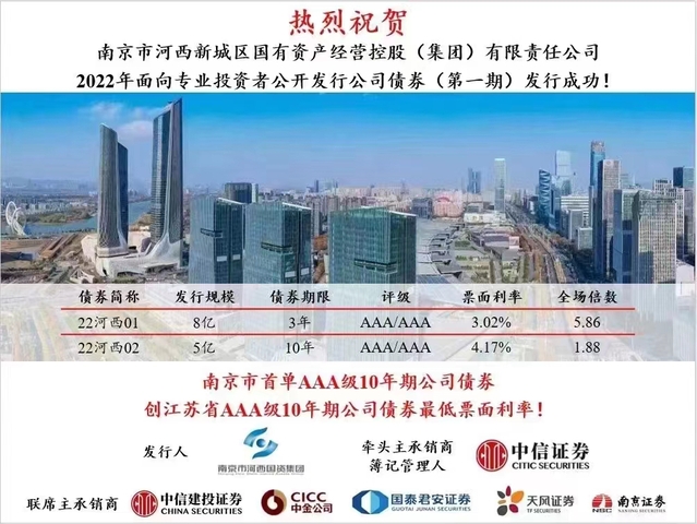 本次發(fā)行為批文下首期發(fā)行,由中信證券擔任牽頭主承銷商及簿記管理人在主承銷商的共同努力下獲得了圓滿成功。本次發(fā)行獲得了市場投資者的高度認可,體現(xiàn)投資人對河西集團未來業(yè)務發(fā)展的強烈信心!本次發(fā)行的10年期品種,亦為南京市首單10年期公司債券。河西集團本次發(fā)行10年期公司債券,以較低的融資成本鎖定長期的資金需求,充分體現(xiàn)河西集團對市場時機的準確把握以及對直融市場融資工具成熟的使用能力,為債券市場作出了積極的示范效應。