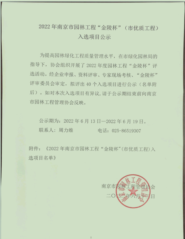 近日,由河西集團(tuán)新城公司溧水項(xiàng)目部代建的溧水區(qū)秦淮大道改造景觀提升工程順利通過南京市園林工程管理協(xié)會(huì)組織的”金陵“”評(píng)審,成功入選2022年南京市園林工程“金陵杯”(市優(yōu)質(zhì)工程)項(xiàng)目名單。