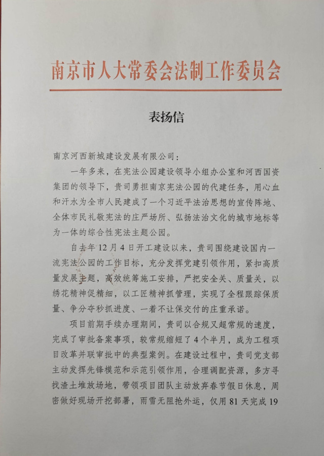 近日,河西集團新城公司收到南京市人大常委會法制工作委員會表揚信,信中對新城公司順利履約憲法公園項目代建任務表示了肯定與感謝。
